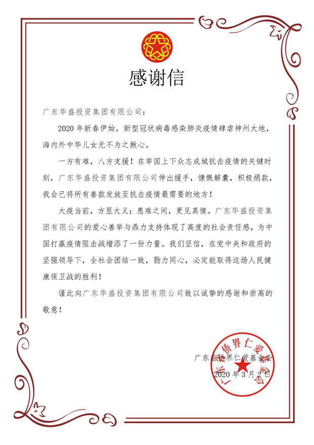 近日。新型冠状病毒感染肺炎。引发的疫情牵动着每个中华儿女的心。2020年1月27日,广东省侨联和广东省侨界仁爱基金会发出驰援抗击疫情的倡议,集团董事长郑继坤先生、总经理郑林栋先生即以广东华体会官方网页版-华体会(中国)集团设立的“侨爱南粤·添一基金”名义捐赠10万元,助力抗击疫情,表达企业应有的社会责任。